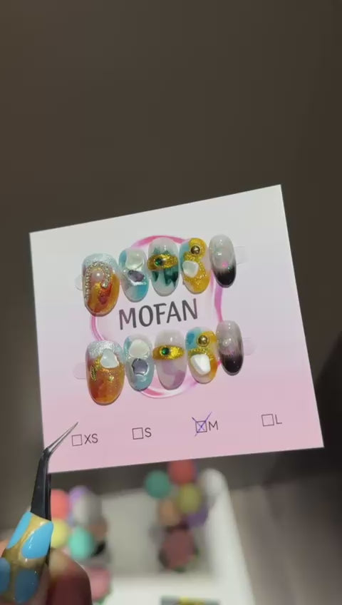 This nail set features a bold and artistic design with a mix of vibrant colors and luxurious textures. The oval, short nails showcase a combination of shimmering metallics, marbled patterns in teal, lavender, and amber tones, and accents of gold glitter. Each nail is embellished with 3D elements such as pearlescent stones, gem-like decorations, and metallic details, creating a dynamic and eye-catching look. Perfect for those who love a statement manicure with a modern, artistic flair.