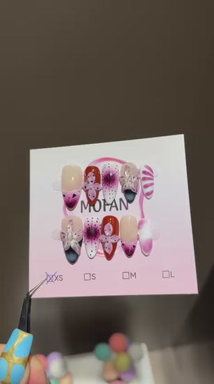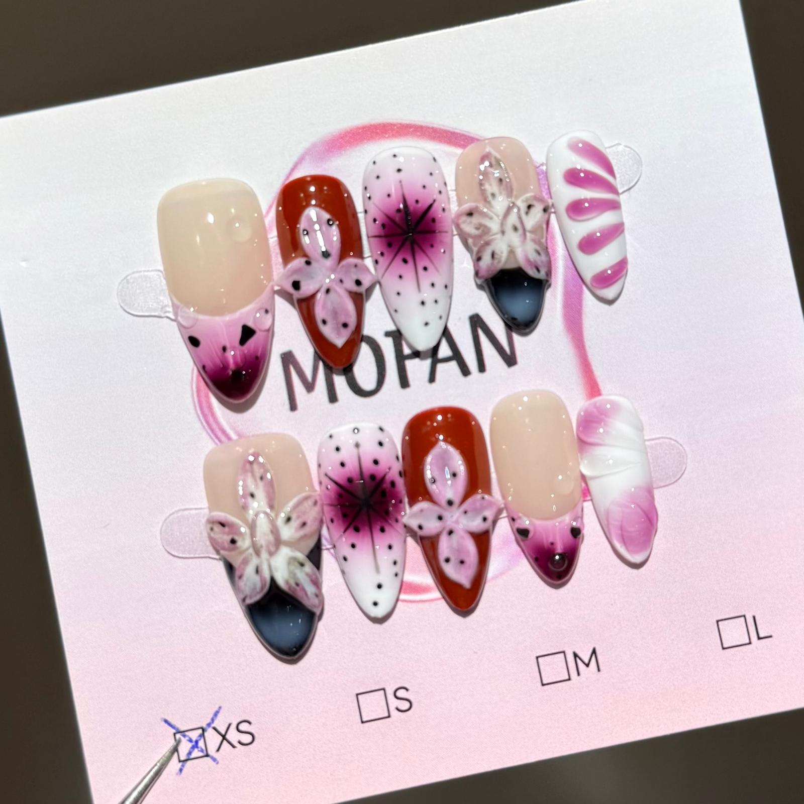 This nail set features an elegant and creative design blending shades of pink, burgundy, black, and white. The oval nails showcase a mix of hand-painted floral patterns, gradient effects, and delicate dot detailing. Some nails are adorned with 3D butterfly embellishments for a soft, feminine touch, while others feature modern swirls and ombré fades. The combination of artistic designs and textured accents gives this set a chic, romantic, and fashion-forward appeal.