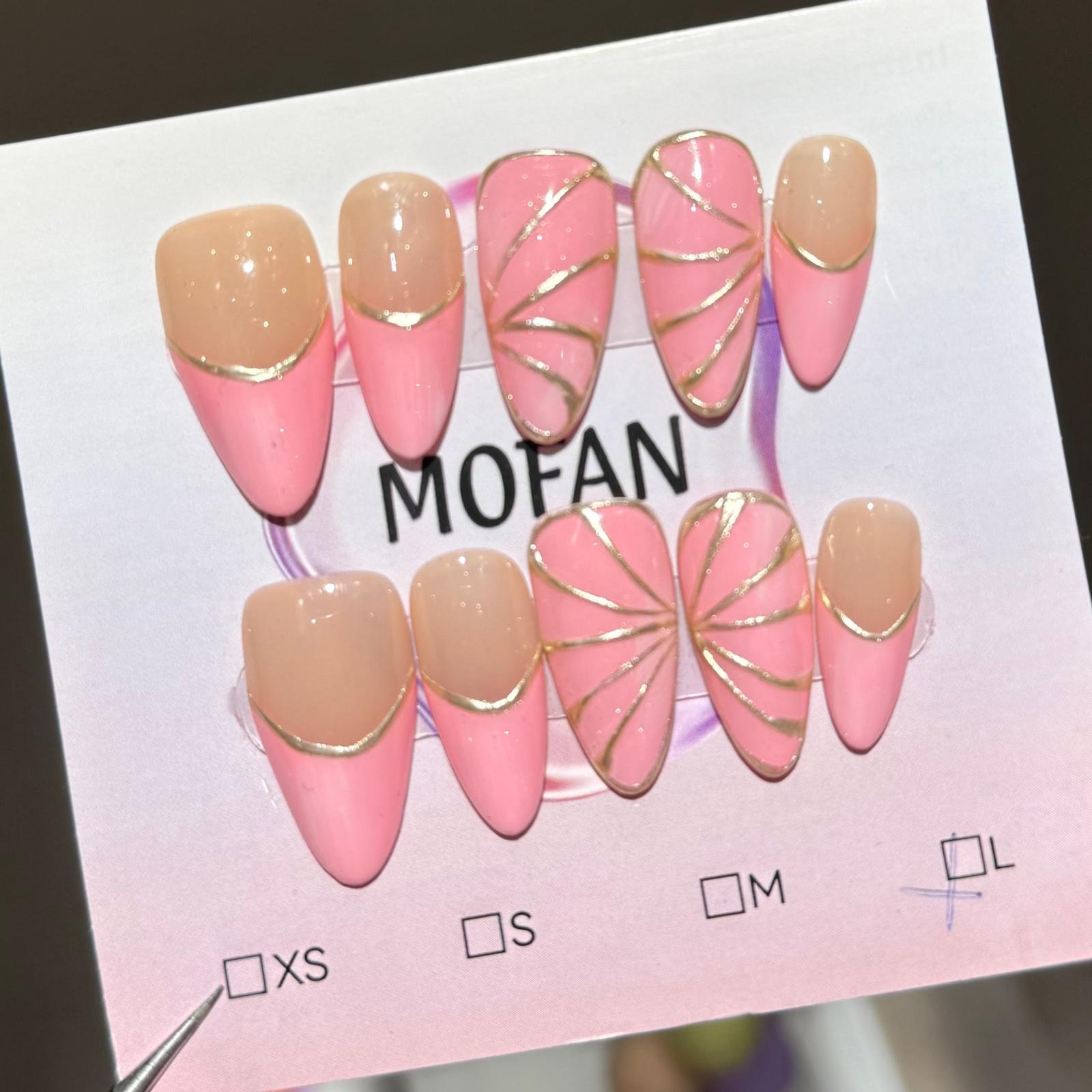 This sophisticated press-on set fetures a classic combination of a nude base and a soft blush pink tip design, all elegantly framed by delicate gold linework. The accent nail is elevated with a striking fanned gold pattern that sweeps across the pink tip, giving the entire set a chic, art deco-inspired movement. It's clean, lxurious look that works for any occasion.