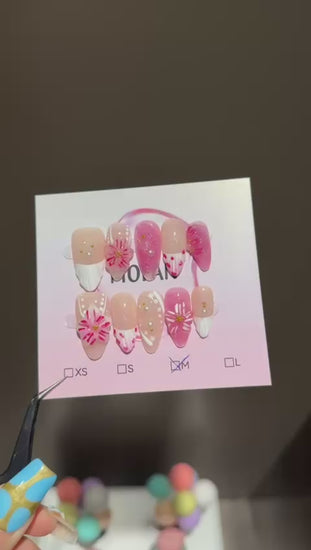 This nail set features a romantic and playful pink floral design with a glossy finish. The design blends soft nude and pink tones, highlighted by 3D flower embellishments, pearls, and gold bead accents for a luxurious touch.