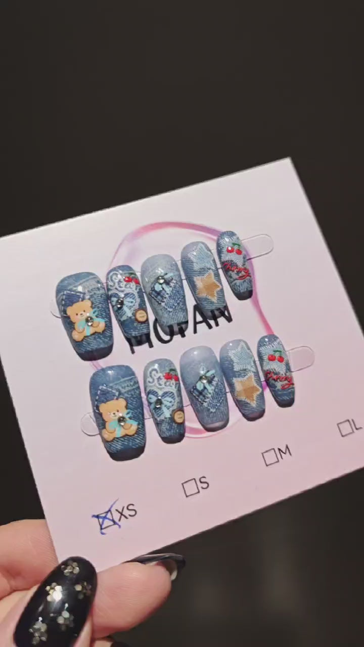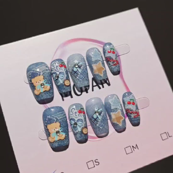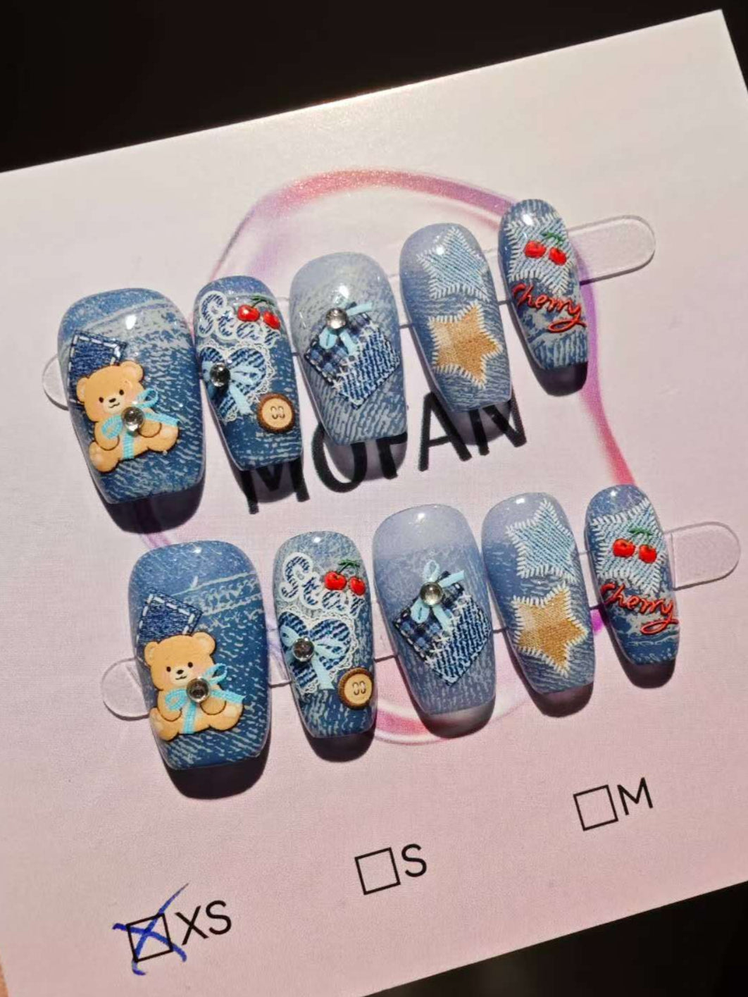 This nail set features a playful, denim-inspired design with a soft blue color palette. Each nail showcases a textured denim background, enhanced with 3D embellishments like teddy bears, buttons, gift boxes, and bows. There are also charming cherry illustrations with a "cherry" script on some nails, along with golden star patches for added flair. Small rhinestones are scattered throughout for a touch of sparkle, creating a cute and youthful aesthetic that blends fun details with a casual, fashionable vibe.