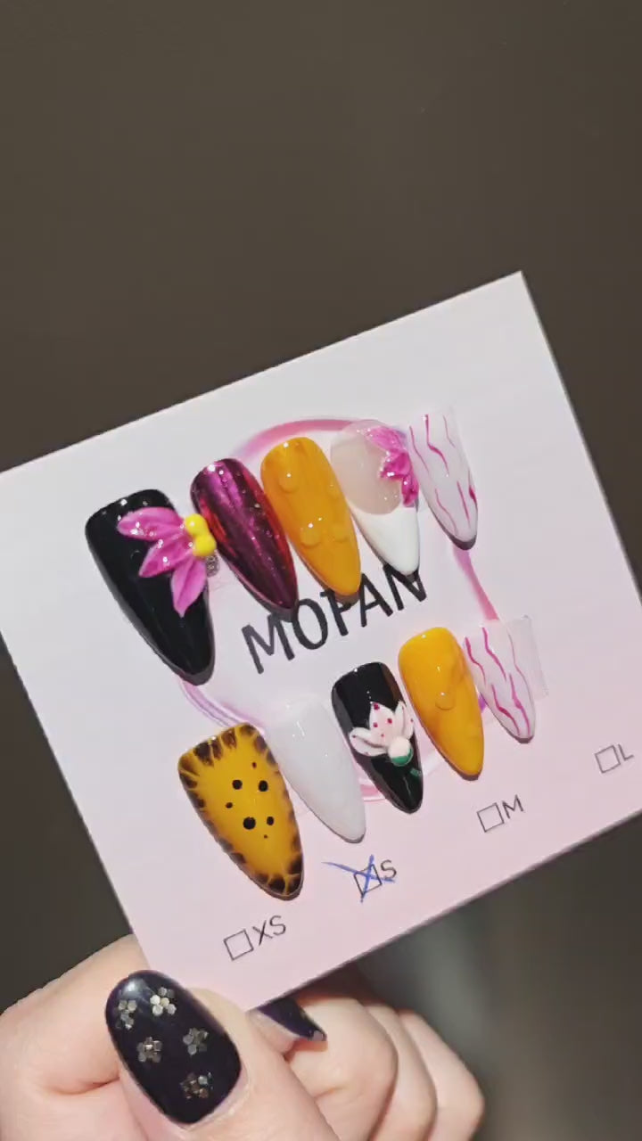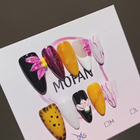 This is an eclectic and vibrant collection of press on nails that mixes high-fashion textures with playful artistry. The designs range from a dramatic glossy black base featuring 3D pink foloral art to a striking metallic chrome mgenta, and a unique mustard yellow with a textured, bumpy finish. It aslo includes abstract art with wispy pink and white stripes, a bold leopard print on yellow, and simple contrasting nails in pure white and solid yello. Perfect foor those who love to switch up their style, this set offers a bled of sophisticated three-dimentional accent and lively, modern patterns.