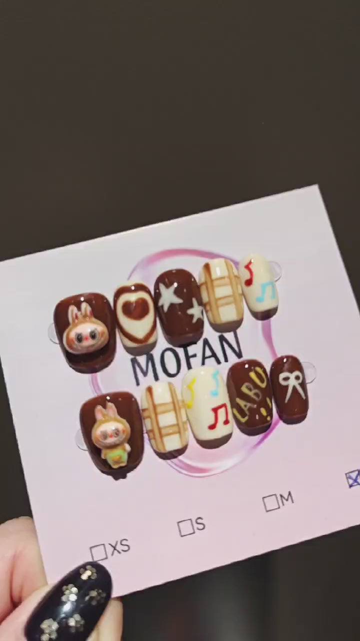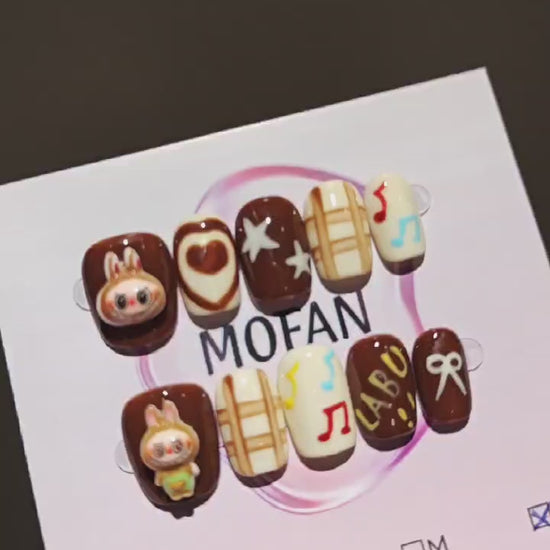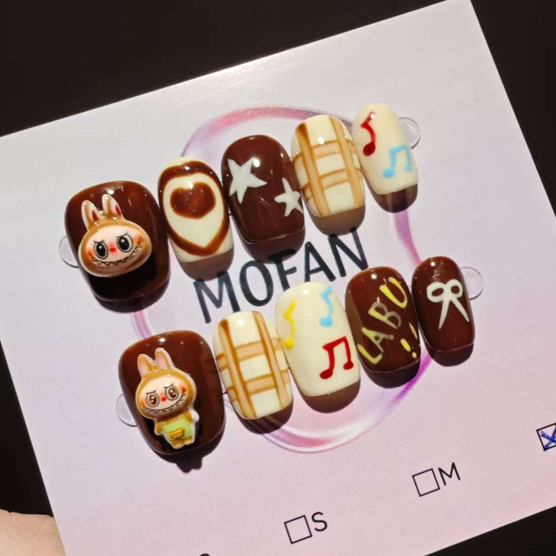 These press-on nails feature a charming, chocolate-themed, and cartoon-inspired aesthetic set on short, rounded-square tips. The color palette is dominated by rich, glossy milk and dark brown and creamy white, mimicking melted chocolate. The set includes a variety of playful designs: a statement nail with an oversized 3D cartoon bunny face; a nail with a simple white heart design painted over the dark brown; nails featuring a white lattice or grid pattern over a creamy white base; a dark brown nail with white star accents, and creamy white nails decorated with colorful music notes. A final accent is a dark brown nail with a simple white ribbon or bow detail, creating a quirky, maximalist design that resembles miniature chocolate treats and cartoon characters.