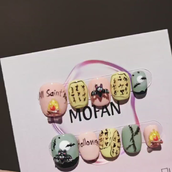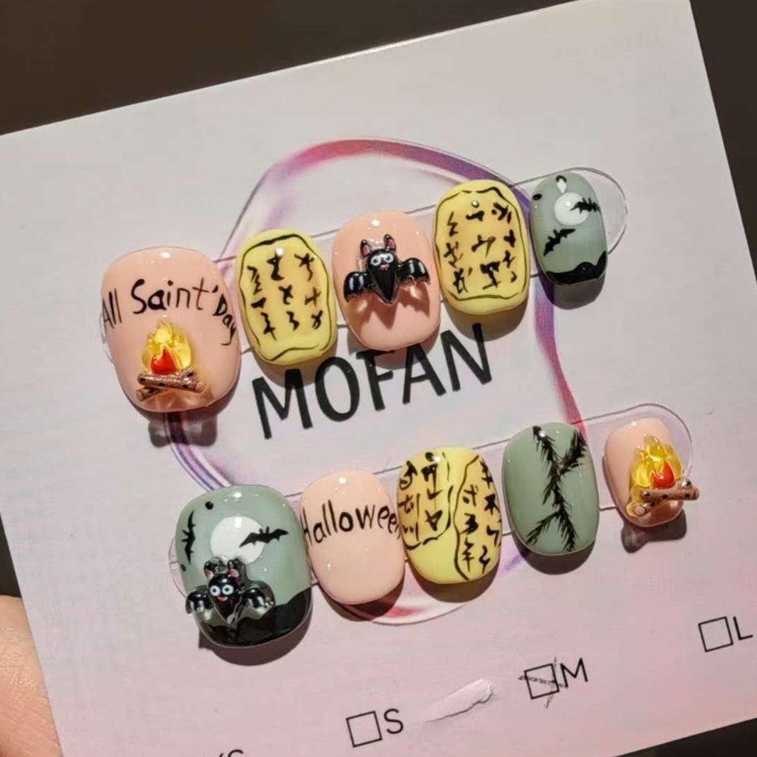 These festive press-on nails feature a whimsical, cartoonish Halloween-themed design set on short, rounded-square tips. The color palette is a unique blend of muted pastels—soft pink, dusty yellow, and pale sage green—contrasted with black and orange for the spooky elements. The set showcases a variety of playful motifs: some nails have a 3D black bat appliqué flying against a pastel background; others feature a dusty yellow base with hand-drawn black sketches resembling spooky trees or fences; a pale pink nail is decorated with text like "Halloween" or "All Saint' Day"; and a standout accent nail features a 3D campfire or small flame detail on a nude-pink base. The designs collectively create a charming and slightly spooky, yet undeniably cute, maximalist look perfect for the fall holiday.