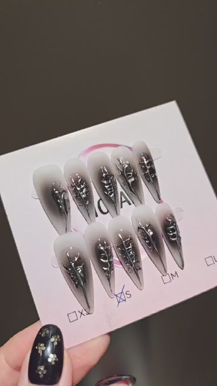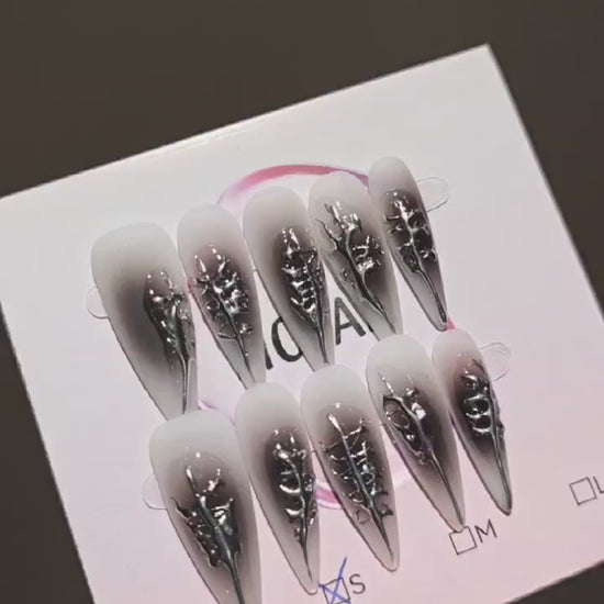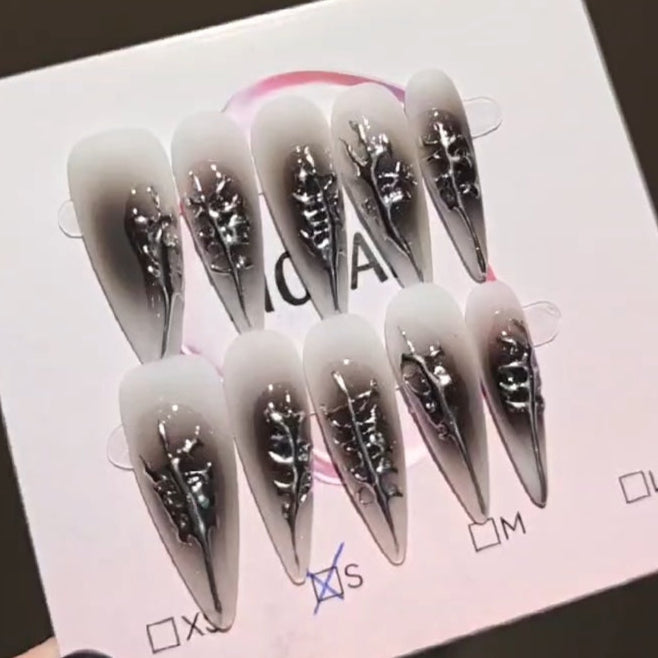 These strikingly dramatic, long stiletto-shaped press-on nails present a bold gothic or dark aesthetic. The base features a distinctive smoky black and white gradient (or ombre), where a sheer, milky white at the cuticle dramatically fades into a deep, opaque black toward the sharp tip, creating a moody, shadowy effect. Each nail is heavily adorned with a large, central 3D metallic appliqué—resembling a stylized, skeletal leaf, vine, or feather—that is finished in a highly reflective, gunmetal or dark chrome silver. This combination of the sharp shape, the intense gradient, and the raised metallic texture results in a powerful, edgy, and high-fashion look.