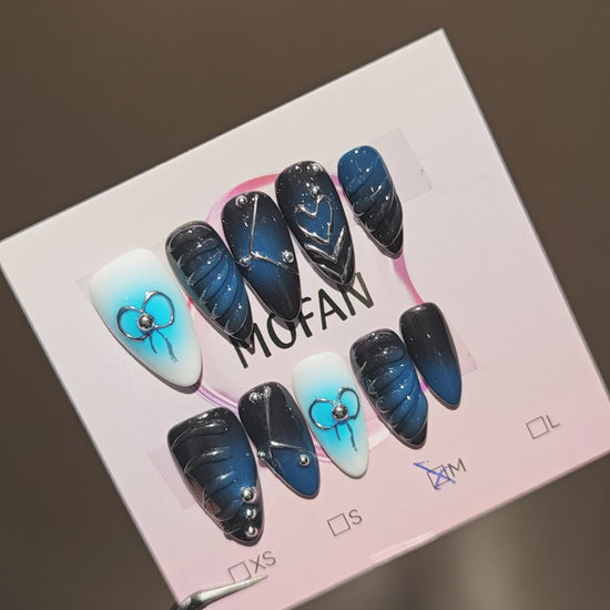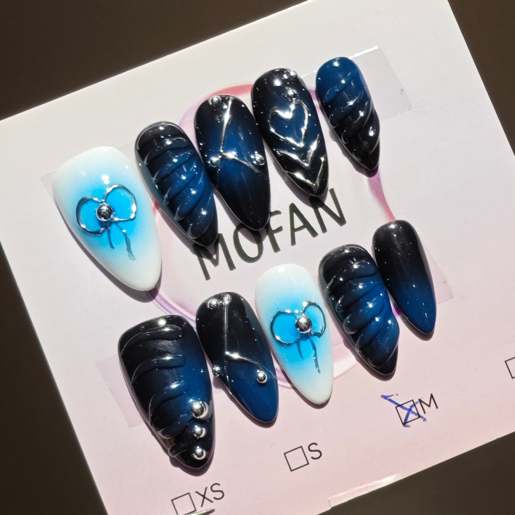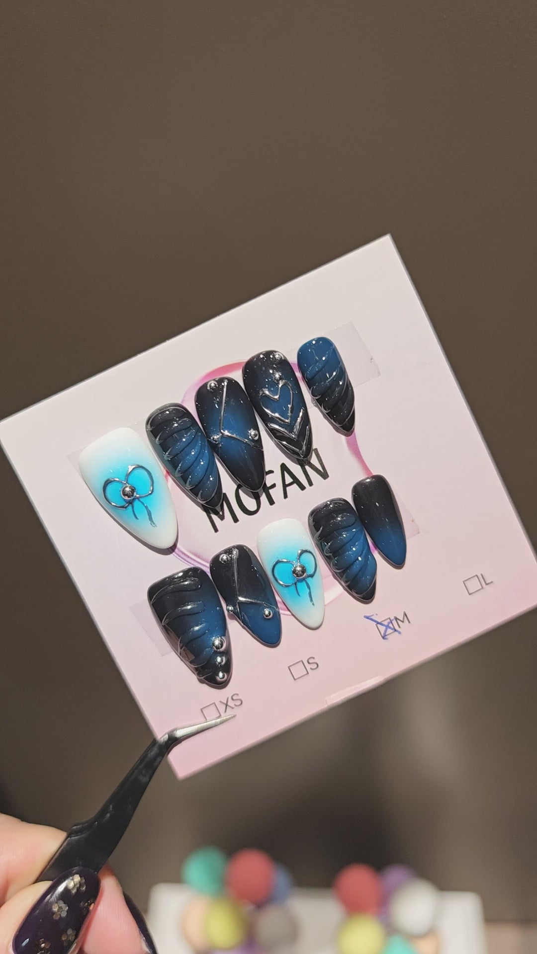 Dive into the mysterious depths of night with our Midnight Aura Press-On Nail Set. Designed with a striking mix of navy blue, gradient black, and crisp white, this set features a variety of celestial-inspired accents—from 3D silver studs and cross-line designs to intricate abstract patterns and heart-like illusions.