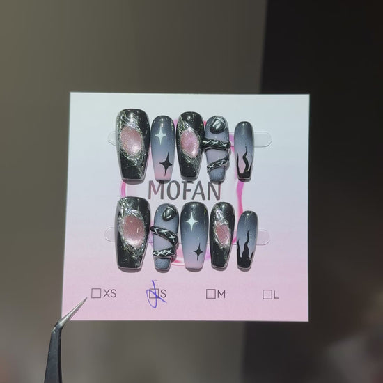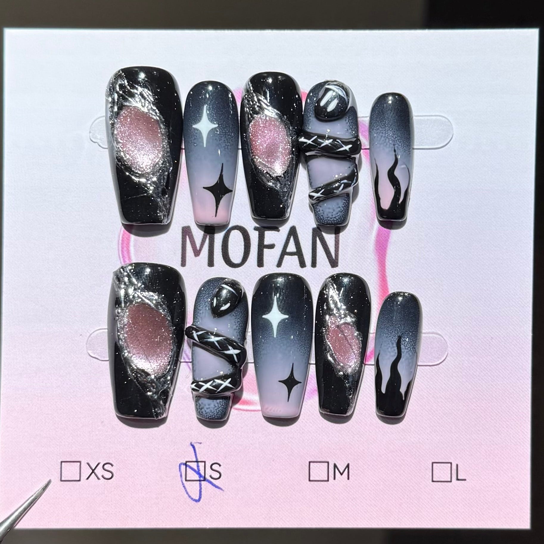These nails have a sleek, cosmic-inspired design featuring a gradient black-to-gray color scheme. The nails are adorned with galaxy-like swirls, stars, and a touch of pink and silver accents, creating a dreamy, otherworldly vibe. Some nails feature intricate details like crosses and flame shapes, adding a mystical or edgy touch to the overall look. The design is modern, bold, and artistic, ideal for someone who wants a unique and attention-grabbing style. The nails appear to be press-ons or pre-designed, indicated by the packaging and size options listed at the bottom.