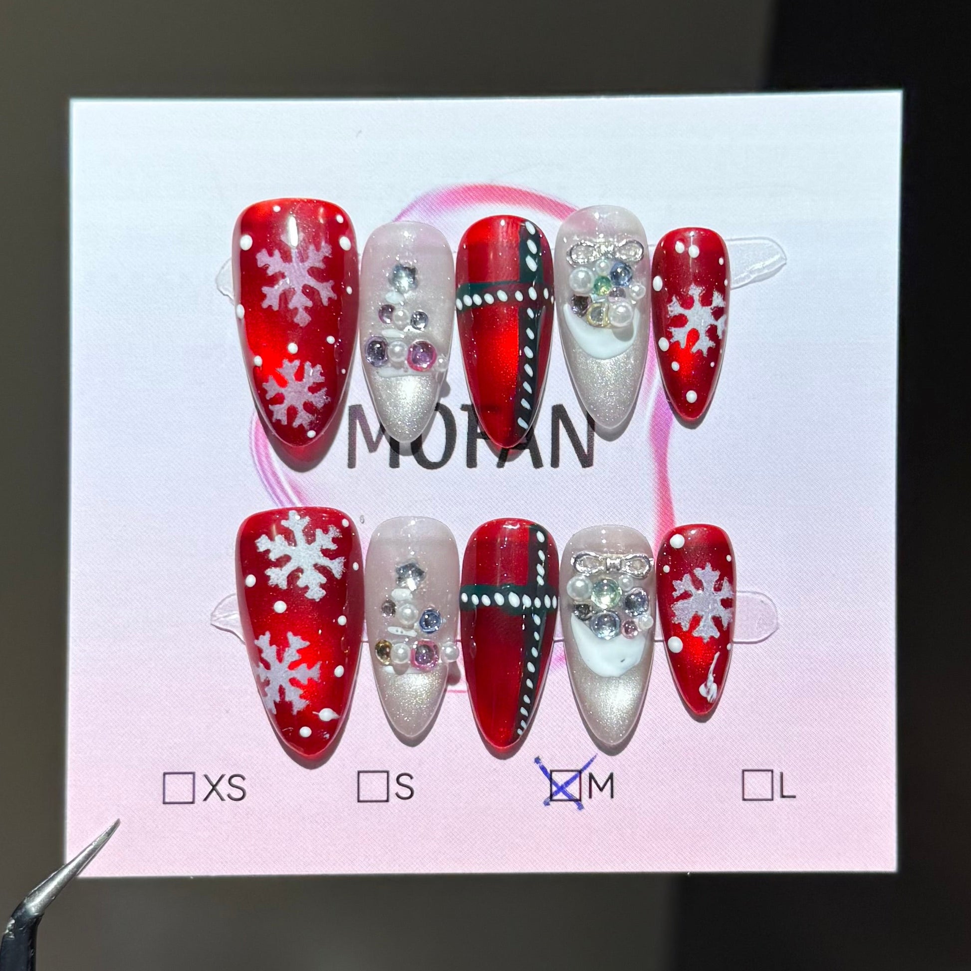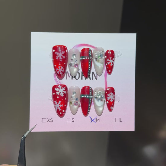 These nails have a festive, winter-holiday design with a bright red and white color palette. Several nails feature bold red backgrounds decorated with detailed white snowflakes, giving them a classic Christmas vibe. Other nails mix in pearly white and shimmering silver accents, along with clusters of tiny rhinestones that add sparkle and dimension.