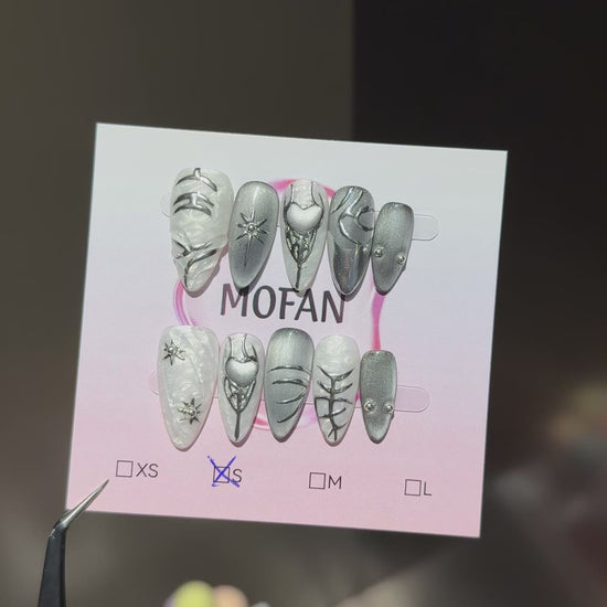 These nails feature a sleek monochrome look with a mix of pearly white and metallic silver tones. The designs are elegant and slightly edgy, incorporating raised 3D details like sculpted leaves, branches, and abstract organic shapes. Some nails have subtle starburst or gem-like accents, adding a bit of sparkle without overpowering the minimalist palette.