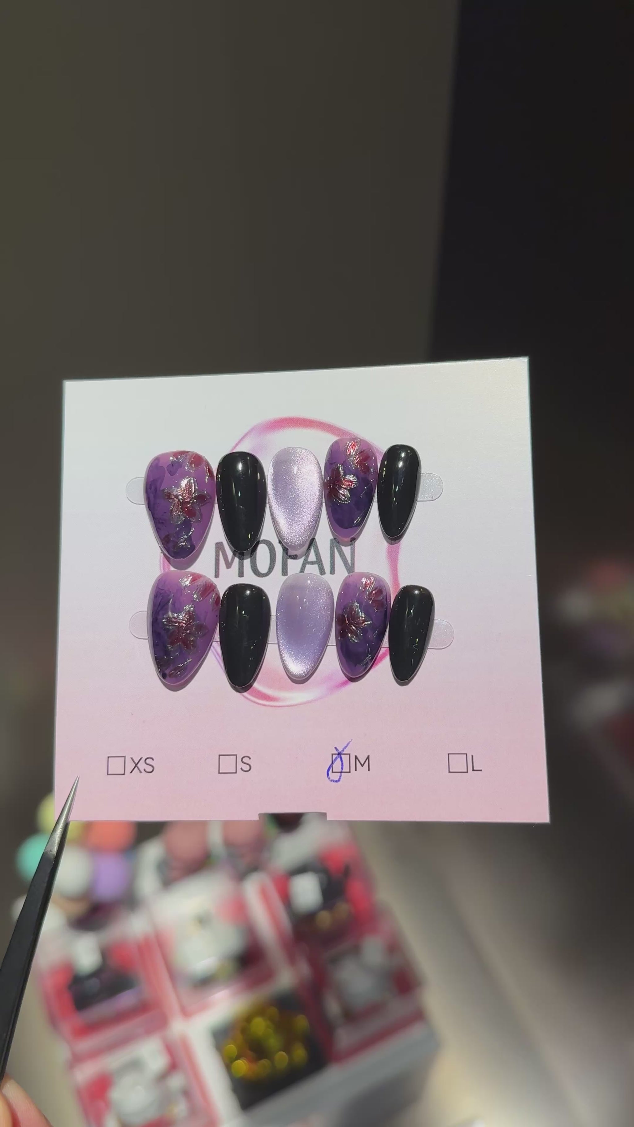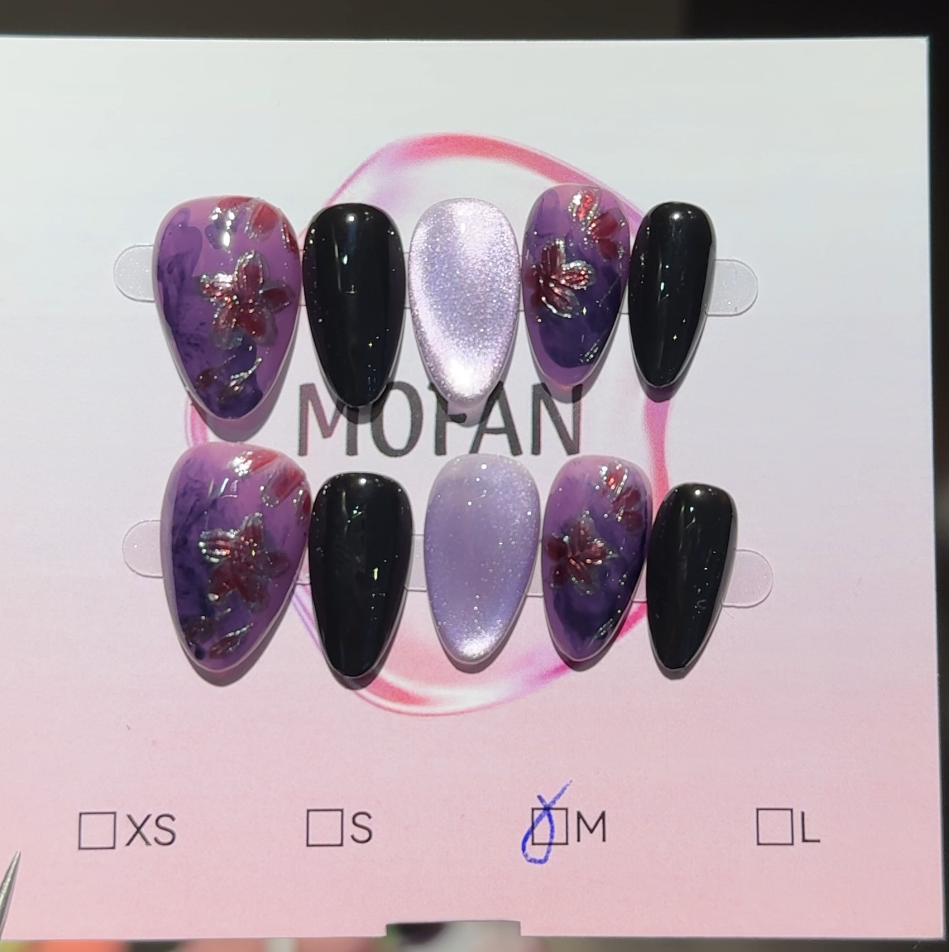 Bold press-on nails combining deep purple florals with glossy black accents and a soft shimmer for a dramatic, elegant look.