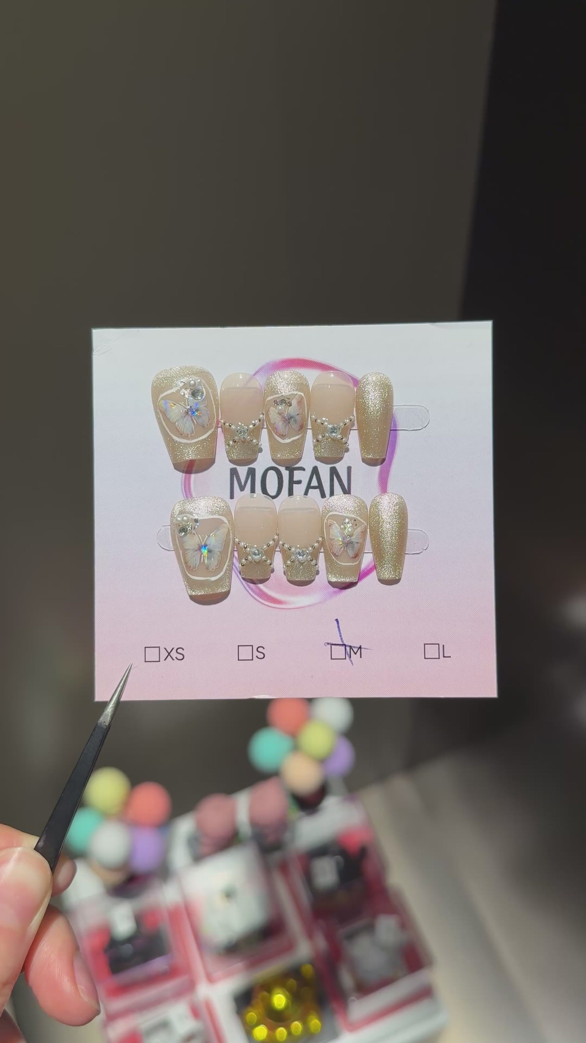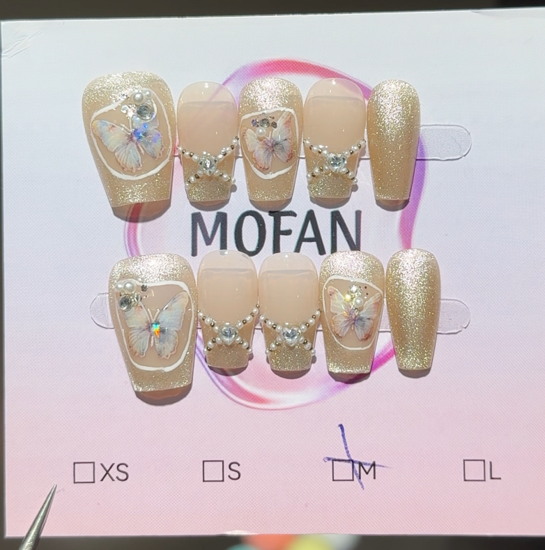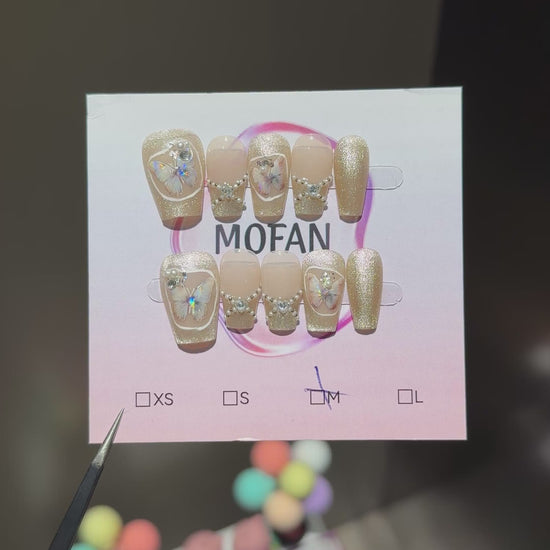Elegant nude-to-gold press-on nails with shimmering butterfly details and delicate rhinestone accents for a soft, dreamy look.