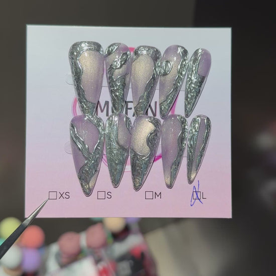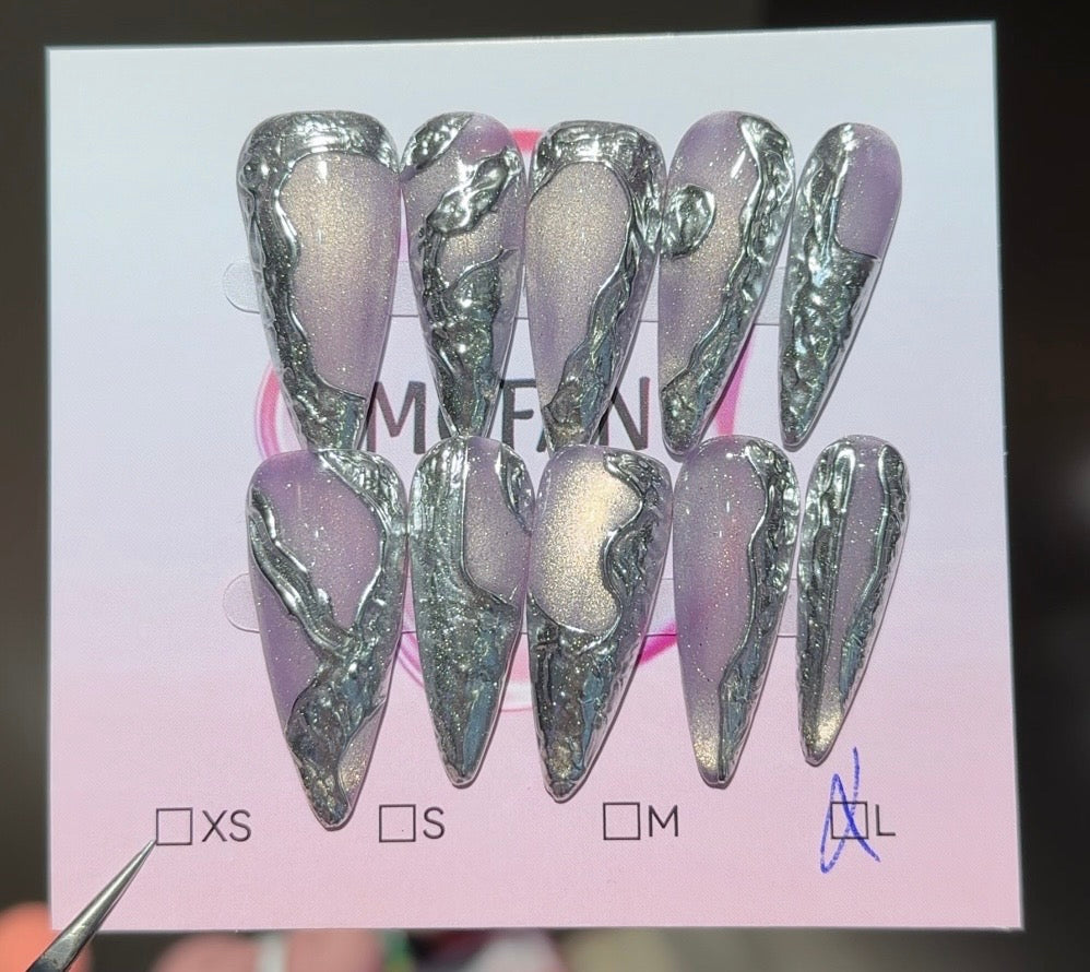 Elegant stiletto nails featuring a soft lilac shimmer base with bold chrome silver abstract detailing for a futuristic, high-fashion look.