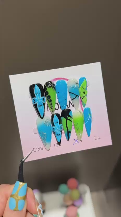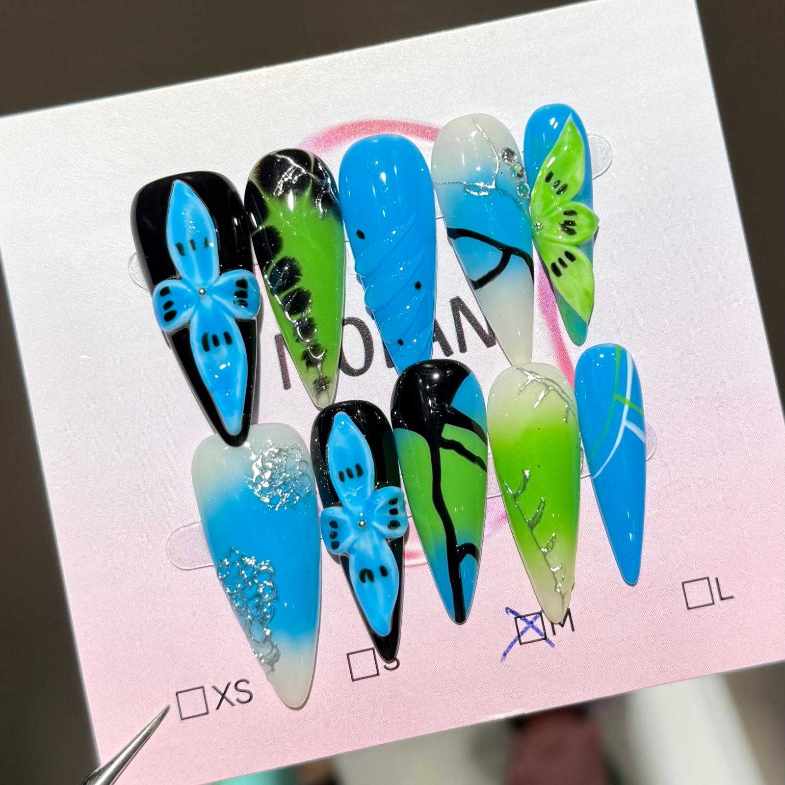 The vibrant, highly dramaric set is a mix of electrical blue, lime green, and glossy black. Key features include striking 3D butterflies and abstract ssplatter designs, all accented by silver chrome drips and bold color-blocking. It's an energetic, edge look that makes a serious statement.